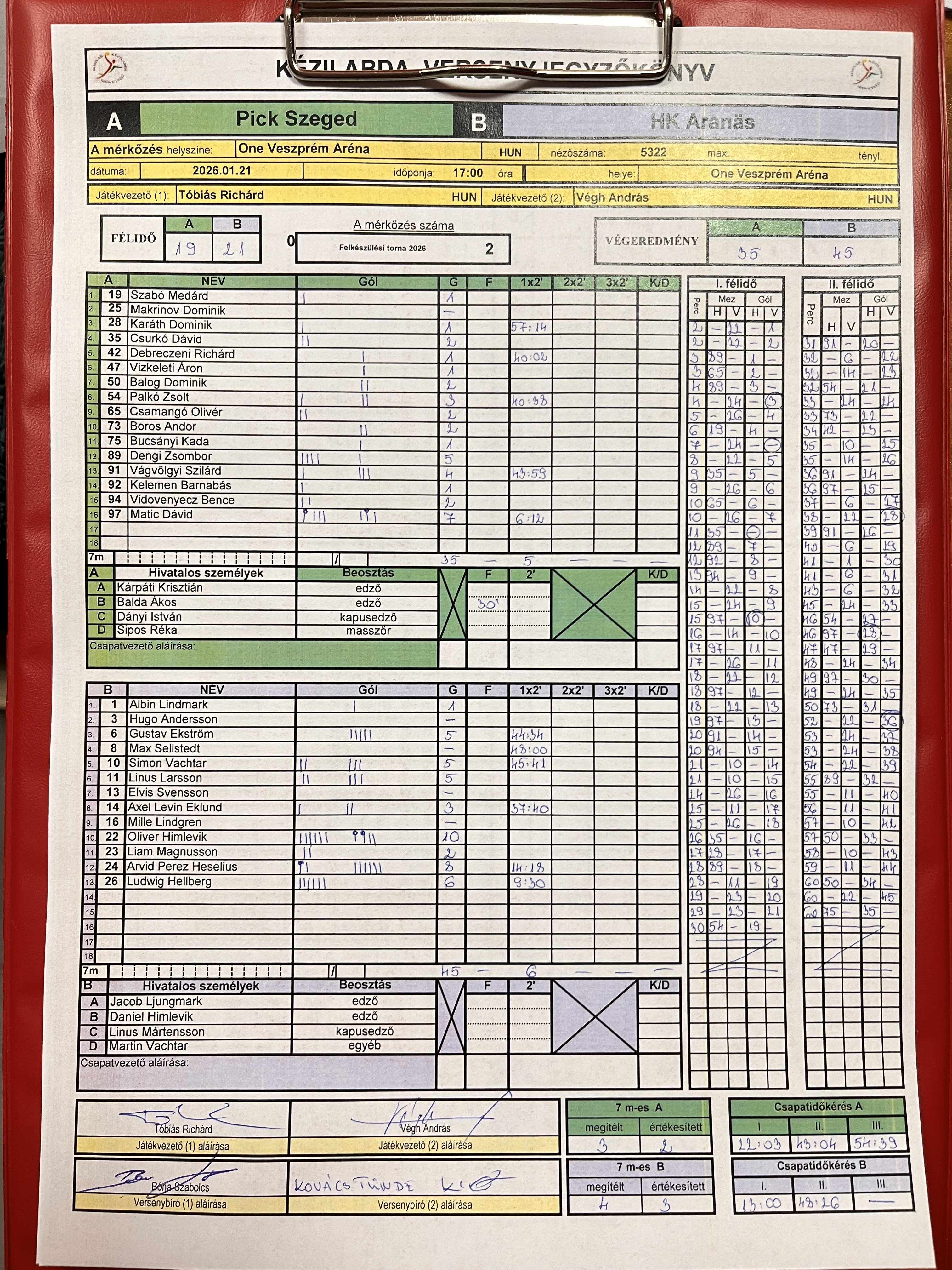A Felkészülési Torna első napjának második mérkőzésén a Pick Szeged csapata a HK Aranäs együttesével csapott össze. Bár a találkozót a skandináv fiatalok kezdték, és két szegedi technikai hibát követően a svédek gyorsan kétgólos előnyt alakítottak ki a mérkőzés elején. A Szeged azonban hamar reagált, és rövid időn belül kiegyenlítette az állást. Ezt követően felgyorsult a játék, mindkét oldalon sorra születtek a gólok. A Szeged és az Aranäs egyaránt gyors lerohanásokkal próbálta irányítani a mérkőzést, így a félidő első fele kiegyenlített játékot hozott. A hajrára azonban a szegediek lendülete alábbhagyott, amit kihasználtak a svédek: magukhoz ragadták az irányítást, és két-három gólos előnyt is kialakítottak. Végül az első félidő kétgólos Aranäs-előnnyel ért véget. (19:21 30.perc)
