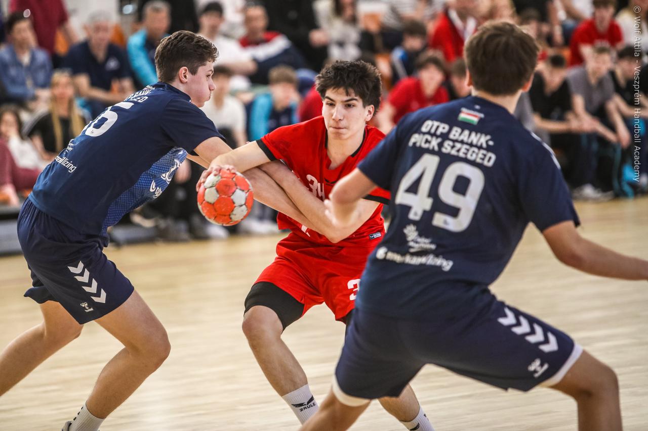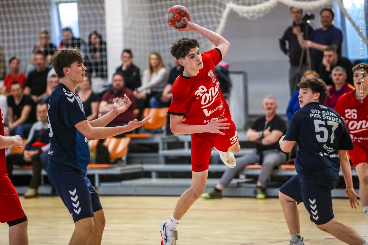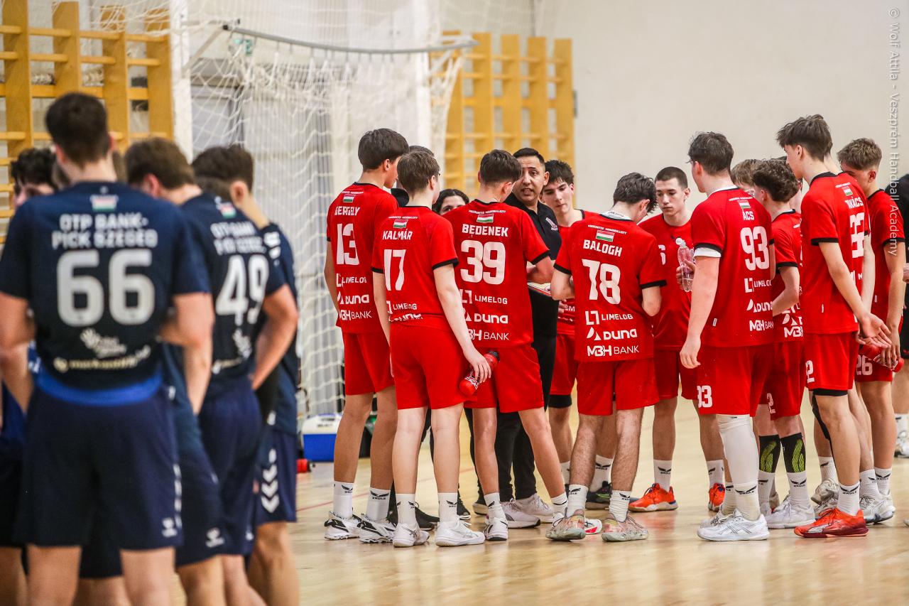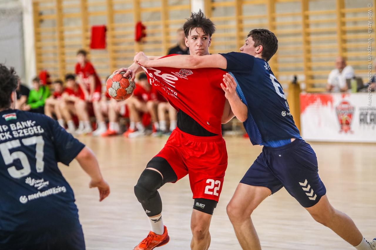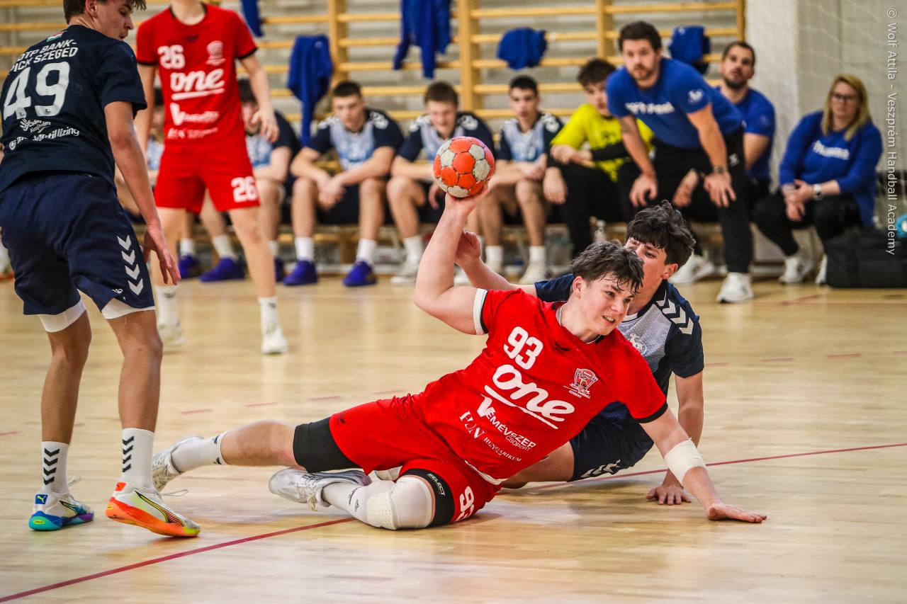 Örökrangadóra telt meg a lelátó a DEVM Csarnokban, az U16 Felsőházában (az I. osztályú bajnokság során idén először) párbajozott az 5. helyen álló csapatunk a jelenlegi listavezető OTP Bank-Pick Szegeddel. A különleges alkalomnak megfelelően a Veszprém piros, a Szeged kék mezben lépett pályára. A hazaiak nyitották a találkozót, kisvártatva Bedenek meg is szerezte a meccs első gólját, de a Szeged sem váratott sokáig az első találatra. A parázs hangulat egyaránt jellemző volt a pályára és a lelátóra is, minden egyes gólt hatalmas üdvrivalgás kísért mindkét oldalról. Az első percekben fej-fej mellett haladtak a csapatok, de két eladott labdából a Szeged rövid időn belül kovácsolt előnyt magának, a 15. percre 6:9-re vezettek, ekkor Virág Sándor felhasználta első időkérését. A támadás végén a labda a kapufáról pattant ki, a Kiskékek újabb találatot húztak be. Bedenek szépítő gólja után hosszú percekig eredménytelenül ostromoltuk a szegedi kaput, a túloldalon viszont további találatokkal nyitották jobban az ollót, a 22. perc elején 7:12-es állásnál két percnyi emberelőnyt nyertünk, Békési pedig hetesből talált be. A létszámfölény további hozadékaként Békési szélről is betalált, majd Ács beállóból faragott a hátrányunkból. A 25. percben 10:12-nél a Szeged kért időt, a támadás során Ács kapott 2 percet, a vendégek pedig újabb gólt szereztek hetesből. A folytatásban Balogh bombájának örülhettünk, majd Novák védett egy kritikus helyzetben, de a Szeged nem engedett a három gólos előnyéből, Békési hetesét is kivédte a kapusuk. A félidő utolsó másodperceiben kétperces kiállítást és hétméterest is kiharcolt Osváth, utóbbit be is húzta, ezzel 12:15 félidei eredménnyel mentek öltözőbe a csapatok.