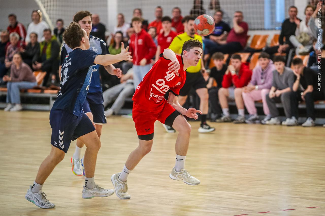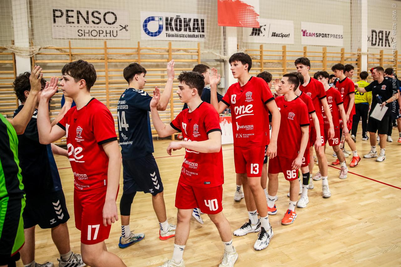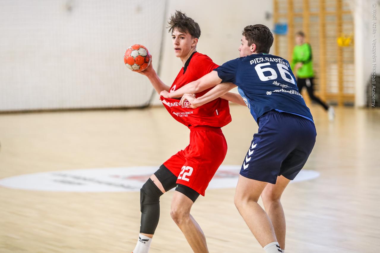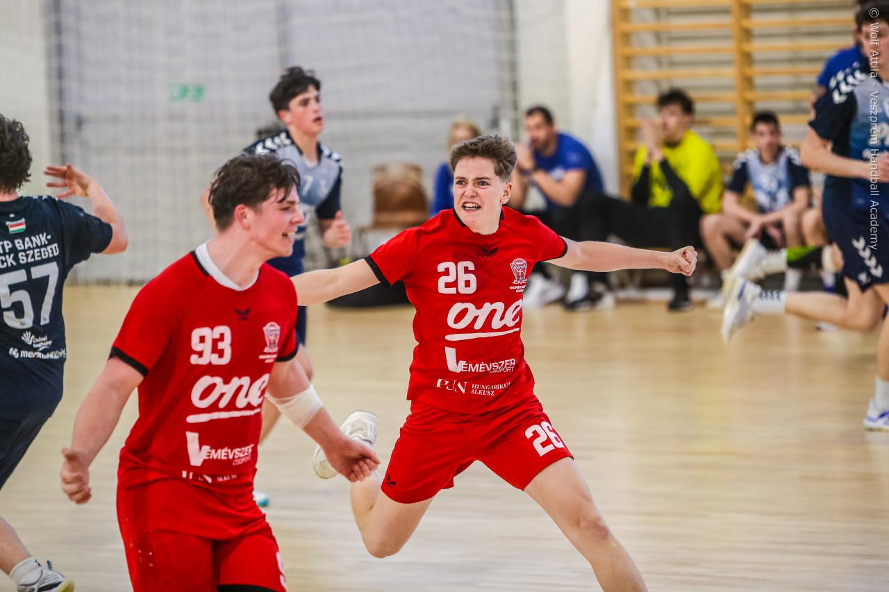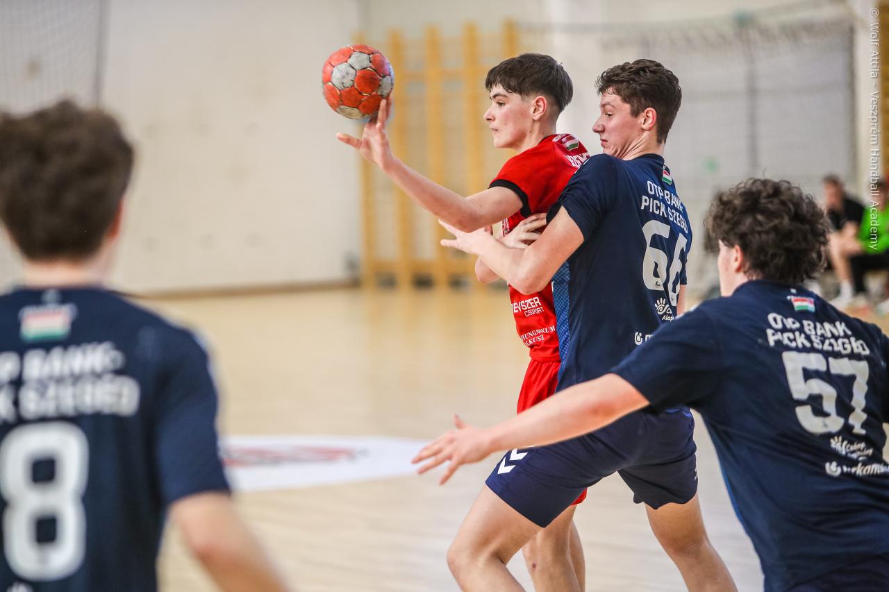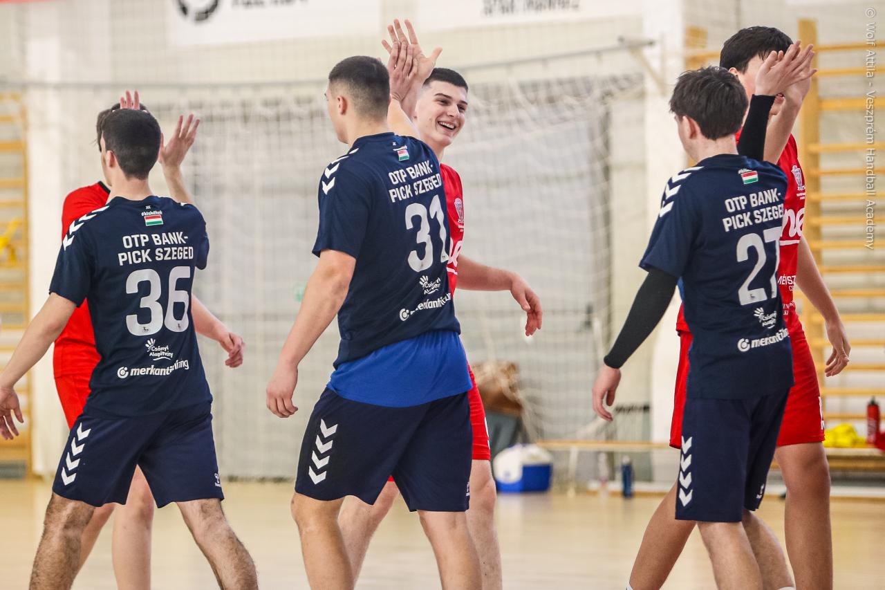 Örökrangadóra telt meg a lelátó a DEVM Csarnokban, az U16 Felsőházában (az I. osztályú bajnokság során idén először) párbajozott az 5. helyen álló csapatunk a jelenlegi listavezető OTP Bank-Pick Szegeddel. A különleges alkalomnak megfelelően a Veszprém piros, a Szeged kék mezben lépett pályára. A hazaiak nyitották a találkozót, kisvártatva Bedenek meg is szerezte a meccs első gólját, de a Szeged sem váratott sokáig az első találatra. A parázs hangulat egyaránt jellemző volt a pályára és a lelátóra is, minden egyes gólt hatalmas üdvrivalgás kísért mindkét oldalról. Az első percekben fej-fej mellett haladtak a csapatok, de két eladott labdából a Szeged rövid időn belül kovácsolt előnyt magának, a 15. percre 6:9-re vezettek, ekkor Virág Sándor felhasználta első időkérését. A támadás végén a labda a kapufáról pattant ki, a Kiskékek újabb találatot húztak be. Bedenek szépítő gólja után hosszú percekig eredménytelenül ostromoltuk a szegedi kaput, a túloldalon viszont további találatokkal nyitották jobban az ollót, a 22. perc elején 7:12-es állásnál két percnyi emberelőnyt nyertünk, Békési pedig hetesből talált be. A létszámfölény további hozadékaként Békési szélről is betalált, majd Ács beállóból faragott a hátrányunkból. A 25. percben 10:12-nél a Szeged kért időt, a támadás során Ács kapott 2 percet, a vendégek pedig újabb gólt szereztek hetesből. A folytatásban Balogh bombájának örülhettünk, majd Novák védett egy kritikus helyzetben, de a Szeged nem engedett a három gólos előnyéből, Békési hetesét is kivédte a kapusuk. A félidő utolsó másodperceiben kétperces kiállítást és hétméterest is kiharcolt Osváth, utóbbit be is húzta, ezzel 12:15 félidei eredménnyel mentek öltözőbe a csapatok.