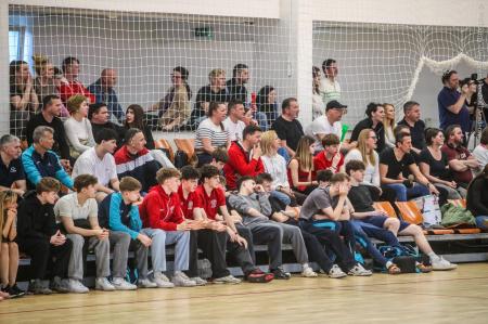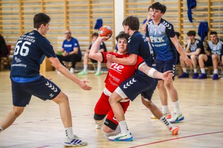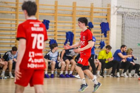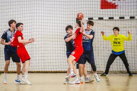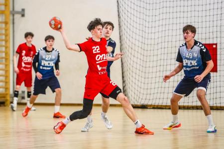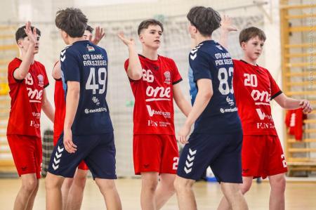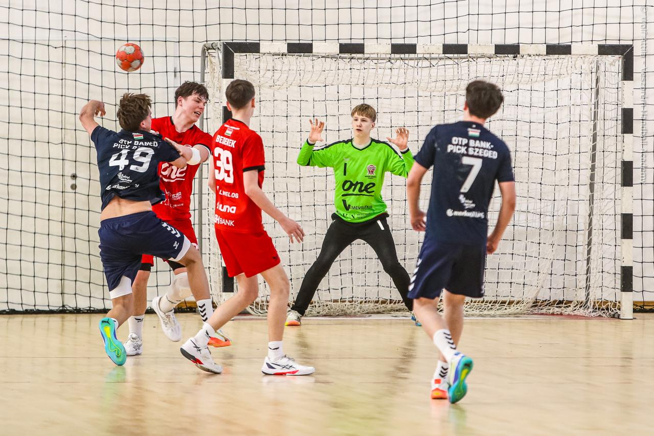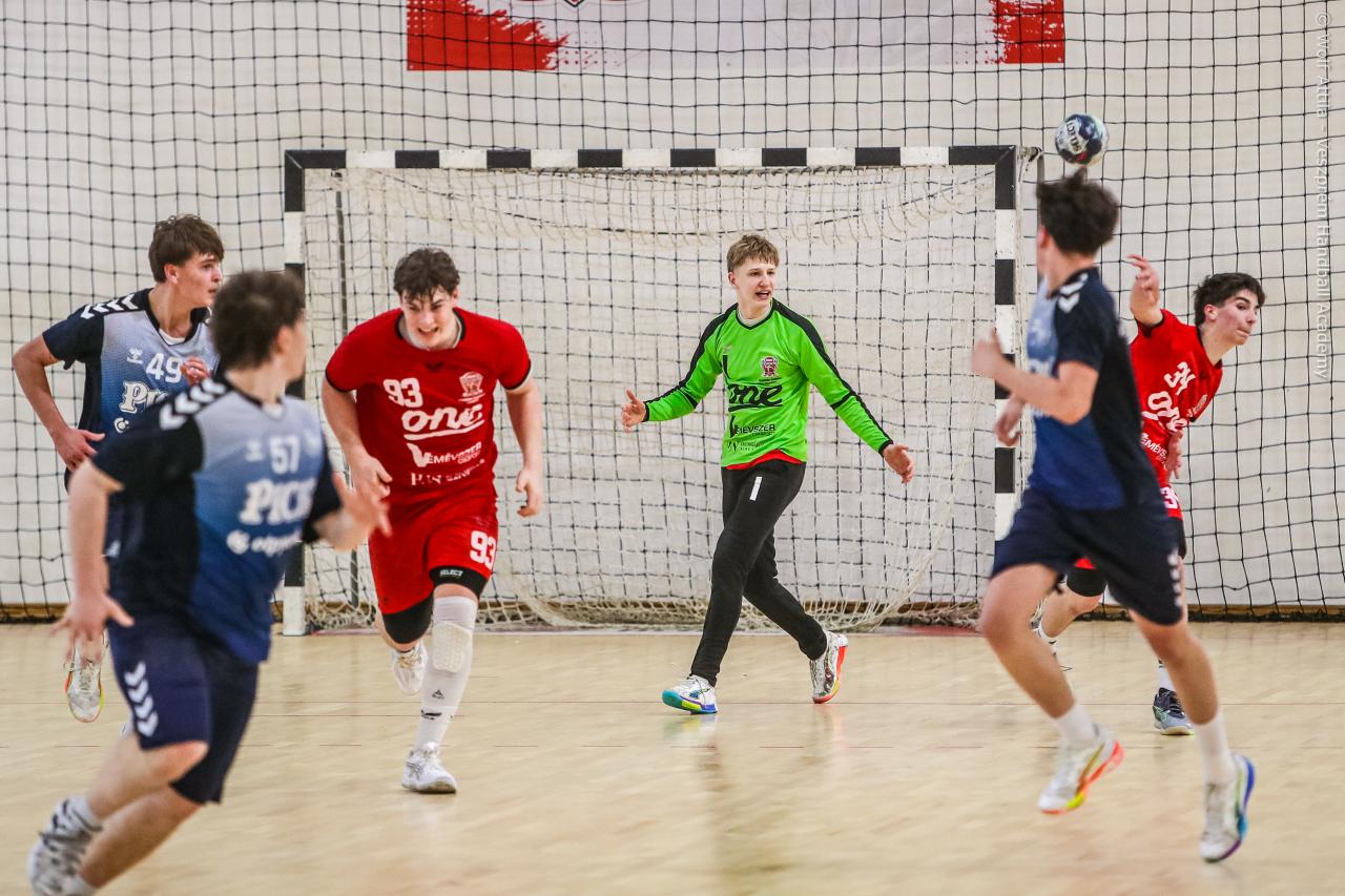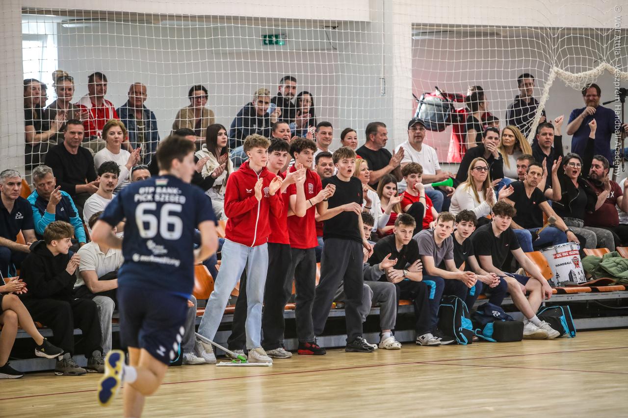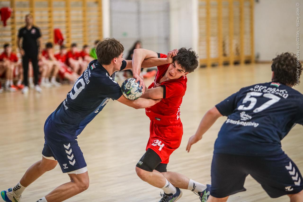 Örökrangadóra telt meg a lelátó a DEVM Csarnokban, az U16 Felsőházában (az I. osztályú bajnokság során idén először) párbajozott az 5. helyen álló csapatunk a jelenlegi listavezető OTP Bank-Pick Szegeddel. A különleges alkalomnak megfelelően a Veszprém piros, a Szeged kék mezben lépett pályára. A hazaiak nyitották a találkozót, kisvártatva Bedenek meg is szerezte a meccs első gólját, de a Szeged sem váratott sokáig az első találatra. A parázs hangulat egyaránt jellemző volt a pályára és a lelátóra is, minden egyes gólt hatalmas üdvrivalgás kísért mindkét oldalról. Az első percekben fej-fej mellett haladtak a csapatok, de két eladott labdából a Szeged rövid időn belül kovácsolt előnyt magának, a 15. percre 6:9-re vezettek, ekkor Virág Sándor felhasználta első időkérését. A támadás végén a labda a kapufáról pattant ki, a Kiskékek újabb találatot húztak be. Bedenek szépítő gólja után hosszú percekig eredménytelenül ostromoltuk a szegedi kaput, a túloldalon viszont további találatokkal nyitották jobban az ollót, a 22. perc elején 7:12-es állásnál két percnyi emberelőnyt nyertünk, Békési pedig hetesből talált be. A létszámfölény további hozadékaként Békési szélről is betalált, majd Ács beállóból faragott a hátrányunkból. A 25. percben 10:12-nél a Szeged kért időt, a támadás során Ács kapott 2 percet, a vendégek pedig újabb gólt szereztek hetesből. A folytatásban Balogh bombájának örülhettünk, majd Novák védett egy kritikus helyzetben, de a Szeged nem engedett a három gólos előnyéből, Békési hetesét is kivédte a kapusuk. A félidő utolsó másodperceiben kétperces kiállítást és hétméterest is kiharcolt Osváth, utóbbit be is húzta, ezzel 12:15 félidei eredménnyel mentek öltözőbe a csapatok.
